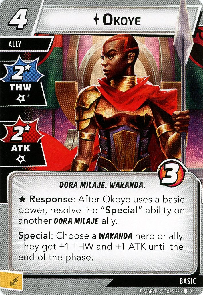 Response: After Okoye uses a basic power, resolve the "Special" ability on another Dora Milaje ally.